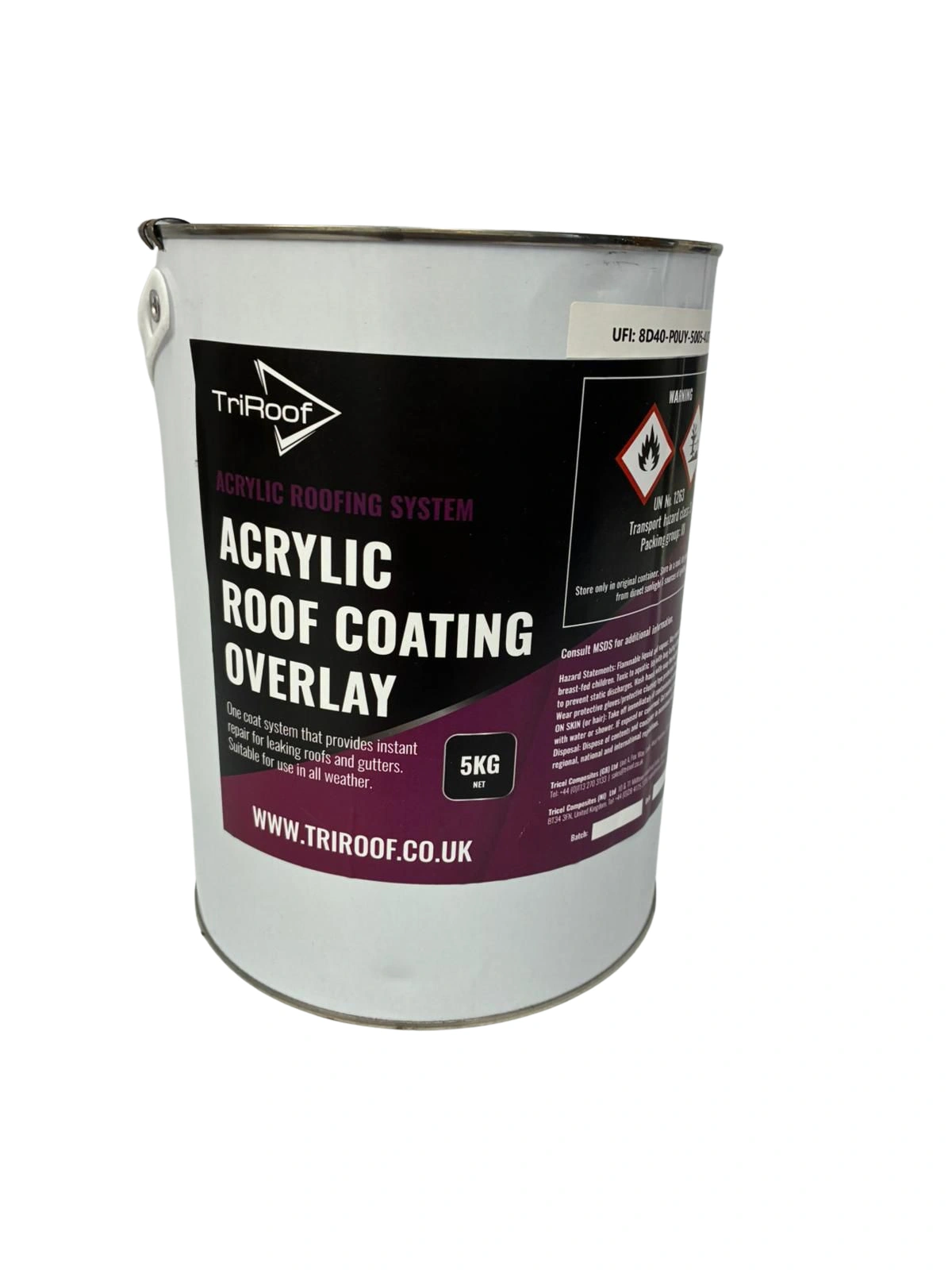 TriRoof Acrylic Roof Coating Overlay is a one component polymeric composition. This repair system is ready for use and cold applied on leaking roofs, gutters and similar structures.